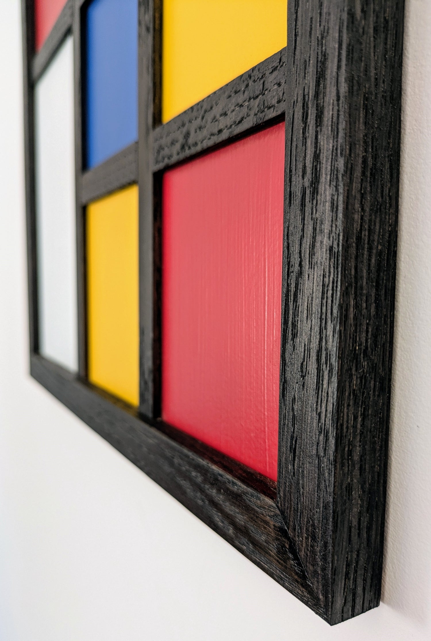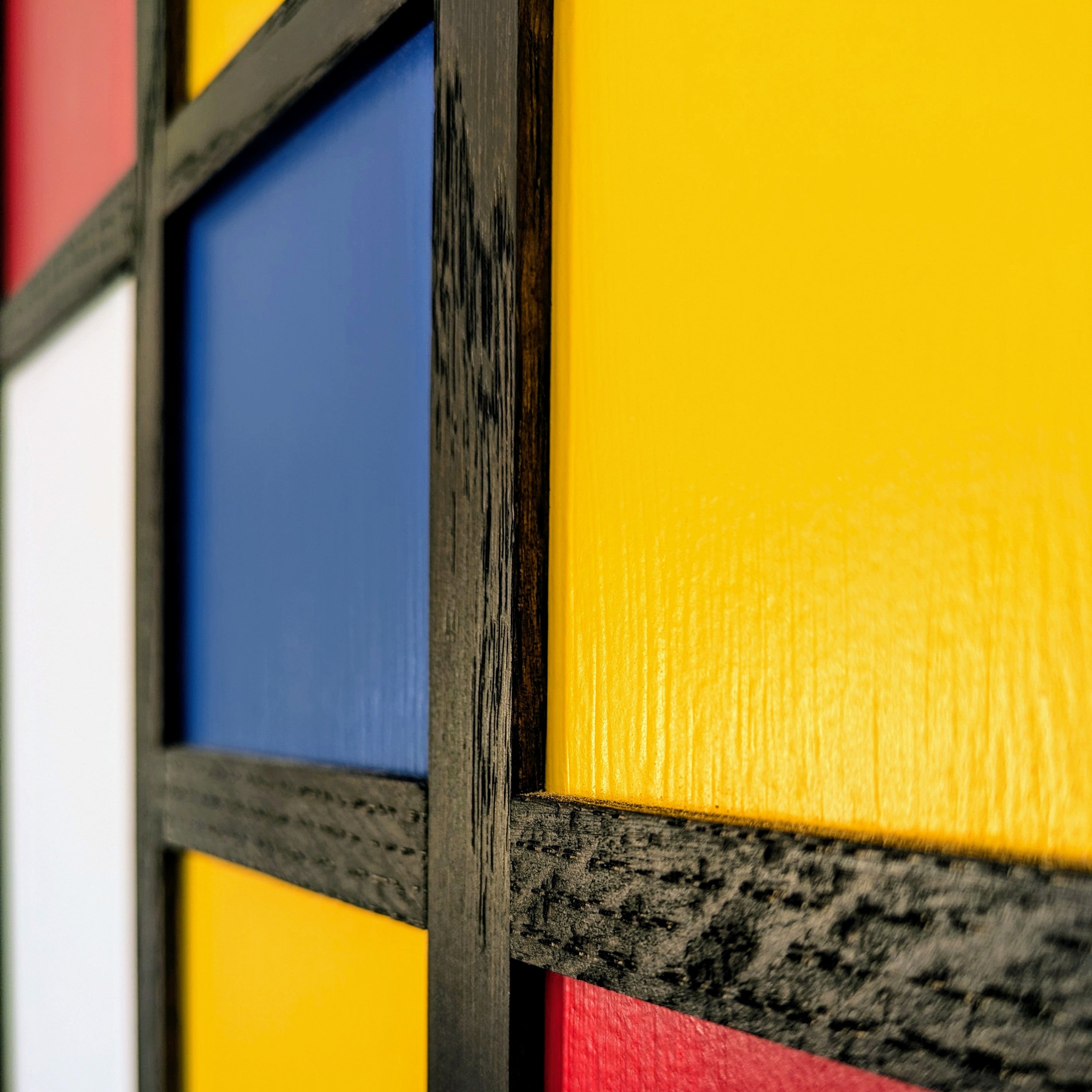 Tre pannelli ispirati al neoplasticismo di Mondrian, con cornici in rovere massello e decorazioni dipinte a mano.