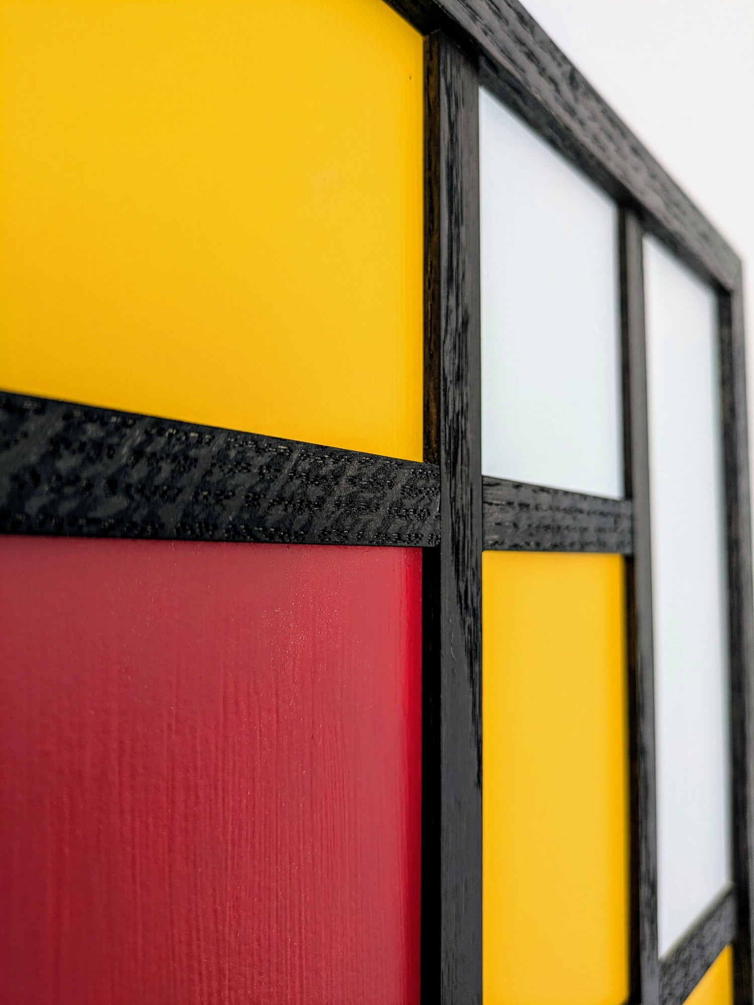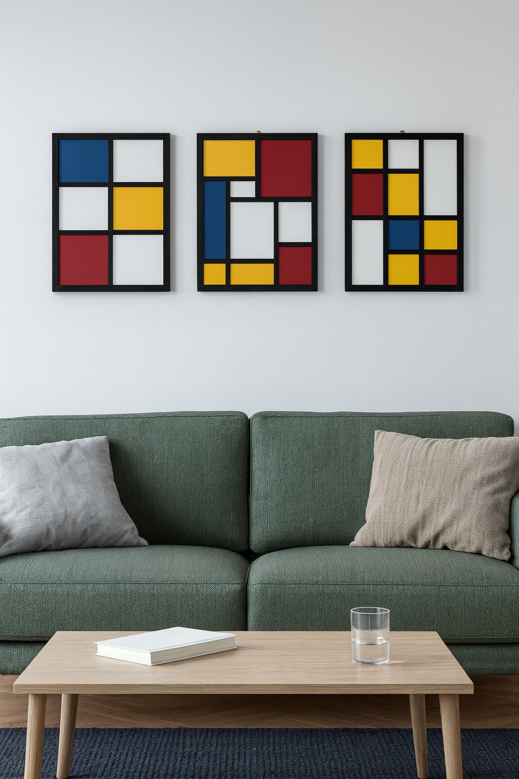 Tre pannelli ispirati al neoplasticismo di Mondrian, con cornici in rovere massello e decorazioni dipinte a mano.