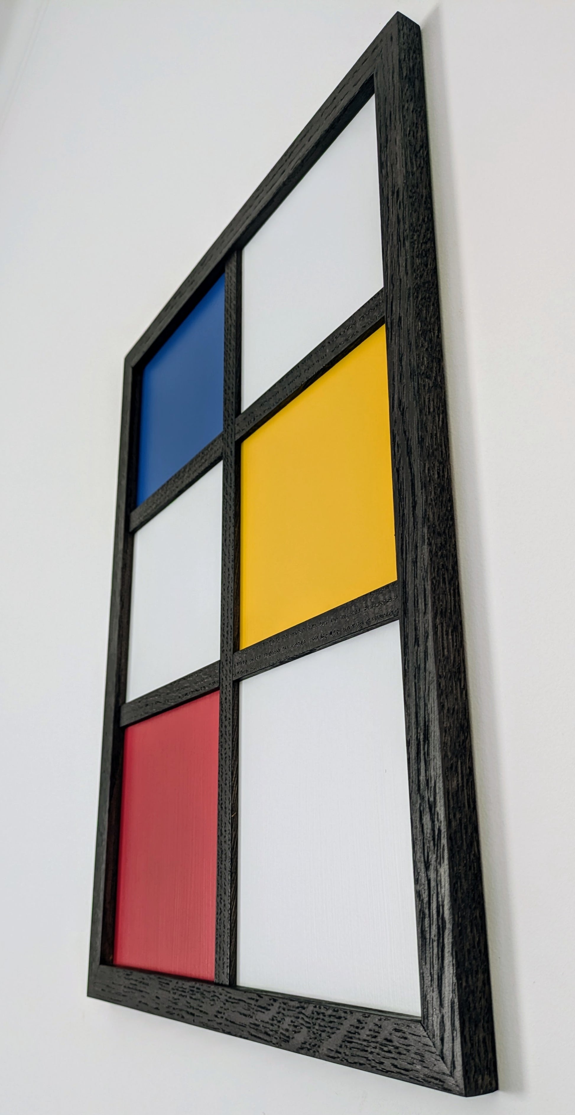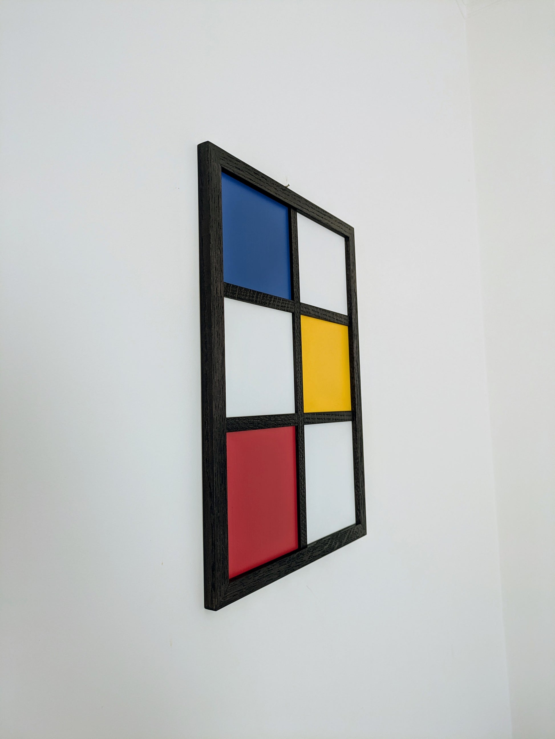 Il primo pannello del Trittico Primario si distingue per la composizione equilibrata di forme semplici e campiture nette nei colori primari. La cornice in rovere massello tinto nero, la finitura opaca e la decorazione in MDF smaltato ad acqua donano un carattere pulito e raffinato.