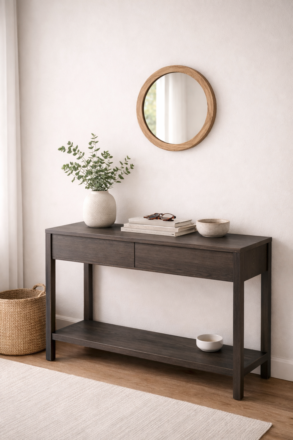 La cornice in rovere naturale valorizza le venature del legno e dona allo specchio un carattere elegante e senza tempo.