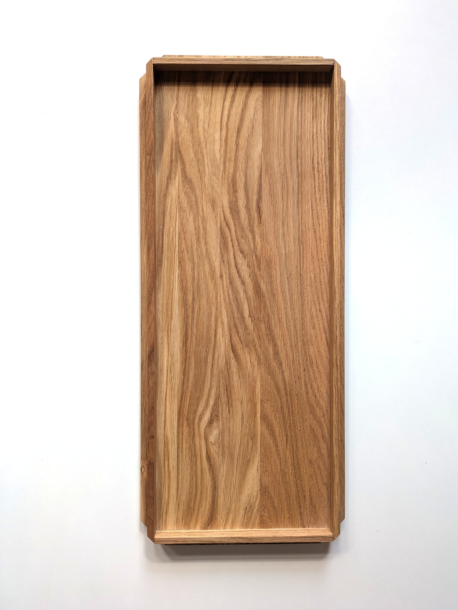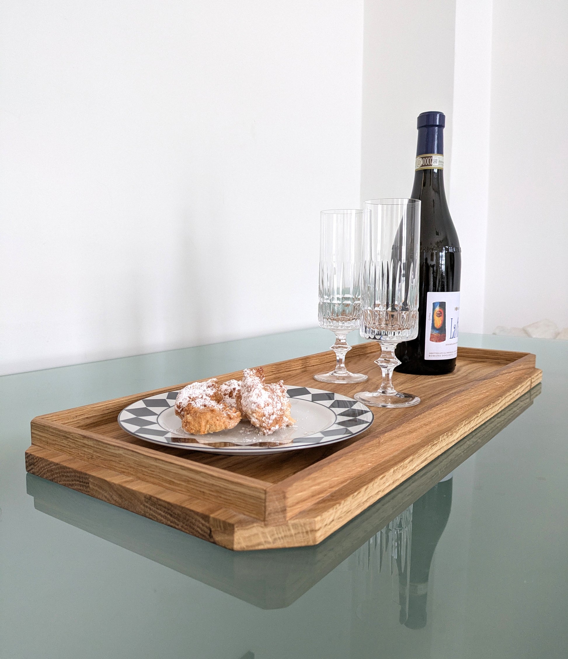 Il vassoio è realizzato in rovere massello naturale, un legno resistente e durevole scelto per la sua bellezza e solidità.